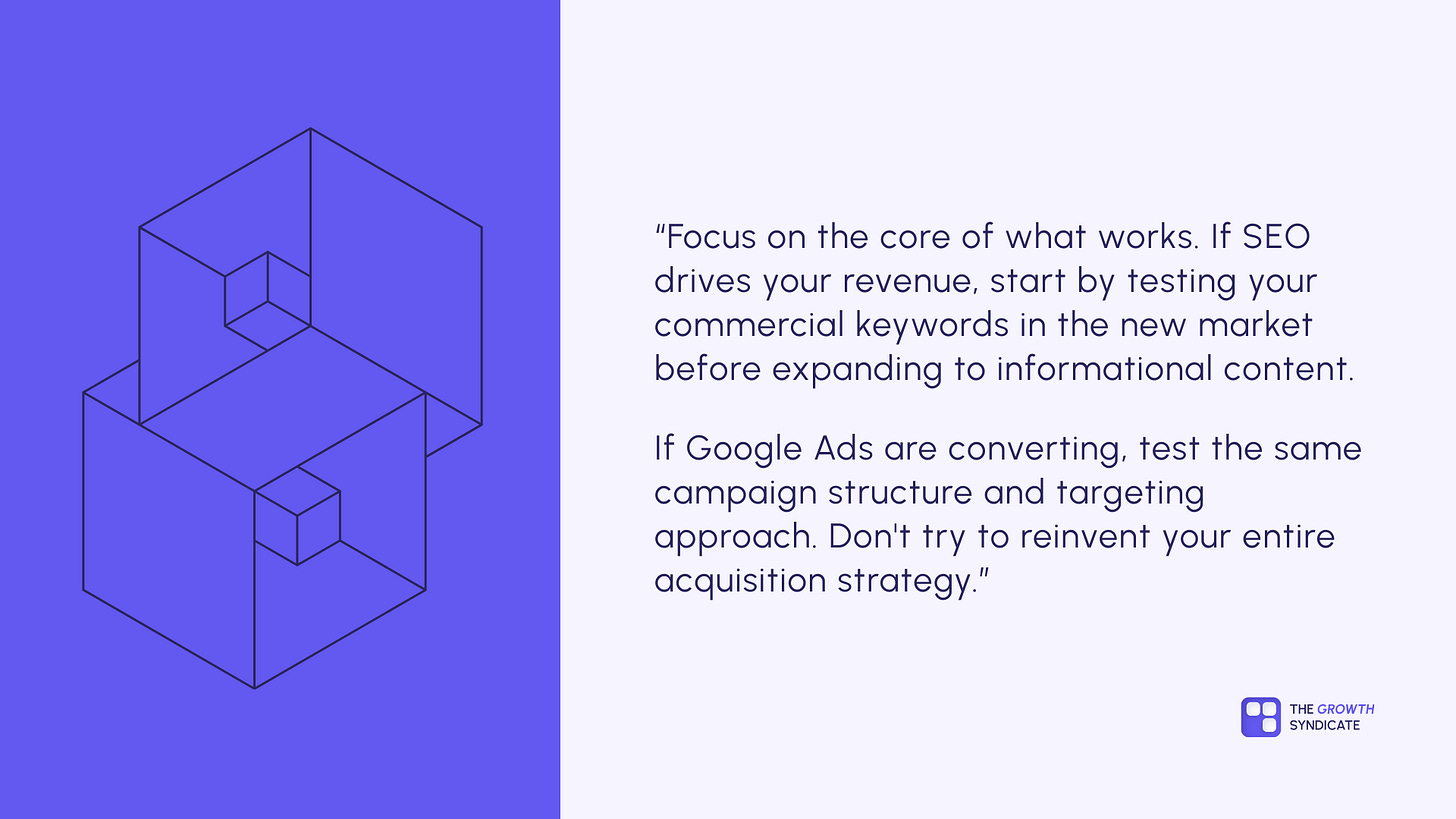 Take a company with strong SEO and paid search at home. First thing to test in expansion? Whether their high-converting keyword strategy works in the new market. Maybe the search volume is different, maybe the competition is tougher, but the fundamental approach often translates with adjustments.