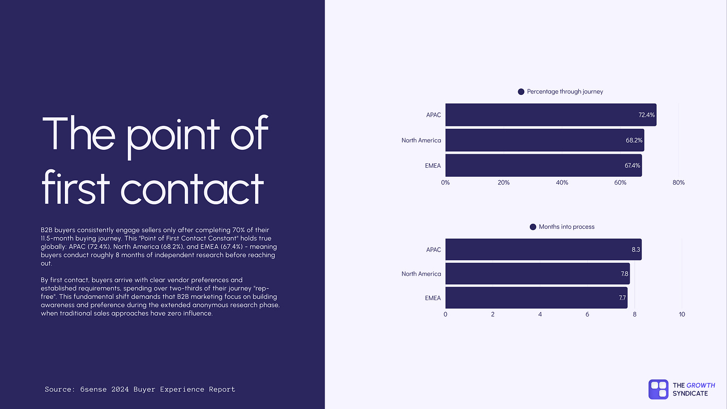 It’s also important to mention that B2B buyers complete 67-72% of their journey before first vendor contact. That means your research needs to understand not just who buys, but how they research and evaluate before they ever talk to you.